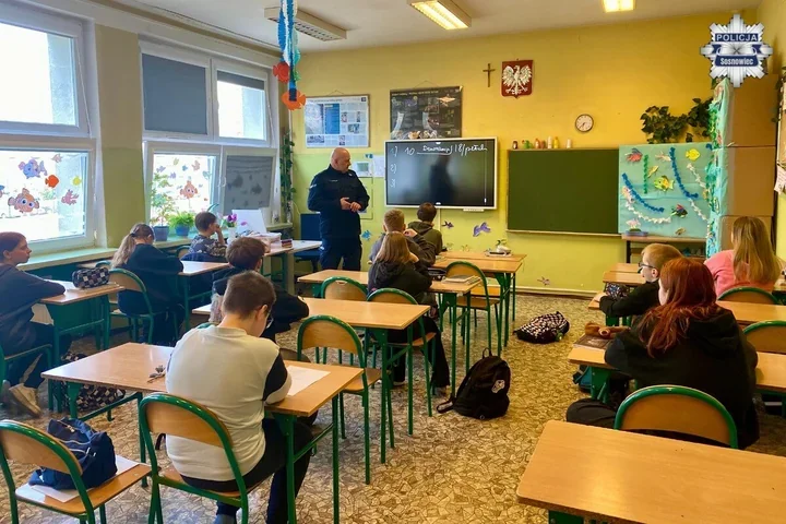 W sali Szkoły Podstawowej nr 38 w Sosnowcu policjant z sosnowieckiego Wydziału Prewencji tłumaczył uczniom, że niektóre decyzje mają realne skutki prawne. Rozmowa objęła odpowiedzialność nieletnich, zjawisko demoralizacji oraz problem hejtu - w sieci i poza nią. Spotkanie miało charakter profilaktyczny i kończyło się wezwaniem do empatii i reagowania na agresję.