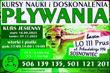 Jesienny kurs grupowej nauki i doskonalenia pływania odbędzie się na basenie szkolnym PRUS w Sosnowcu. To pierwszy z czterech kursów planowanych na rok szkolny 2025/2026, przeznaczony zarówno dla początkujących, jak i dla osób chcących poprawić technikę pływania. Zajęcia prowadzą trenerzy i instruktorzy ze Swim-Fit; grupy są ograniczone liczebnie, a uczestnicy otrzymają czepki i pamiątkowe medale.