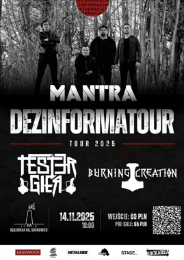W Sosnowcu zaplanowano wieczór z muzyką metalową, podczas którego na jednej scenie wystąpią trzy różne zespoły: Crossover Thrash Tester Gier, thrash/progresywny grunge Mantra oraz melodyjny viking metal Burning Creation. Wydarzenie jest częścią trasy promującej nowy album Mantry i skupia się na prezentacji materiału z płyty wydanej w 2024 roku, a także na koncertowych występach gości.