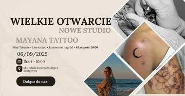 Nowy salon tatuażu Mayana zaprasza na dzień otwarty połączony z całodniowym wydarzeniem z atrakcjami dla odwiedzających. W programie zaplanowano prezentację lokalu i zespołu, promocyjne mini tatuaże, aktywności dla dzieci, zbiórkę darów dla schroniska oraz wieczorną część z muzyką, pokazami i afterparty. Organizatorzy przewidzieli także konkurs i losowanie nagród dla uczestników.